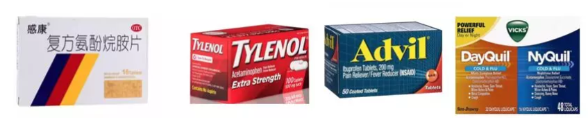 北美代替品: Vicks白加黑 Vicks DayQuil/NyQuil、泰诺Tylenol Extra Strength Caplets、艾德维尔Advil