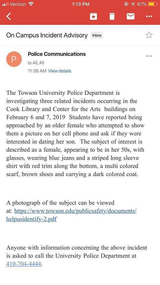译文是:美国马里兰州陶森大学,以为50多岁的亚裔女性被警方通缉。原因是她拿着儿子的照片在校园内问路上的女孩子是否愿意和自己的儿子约会(相亲